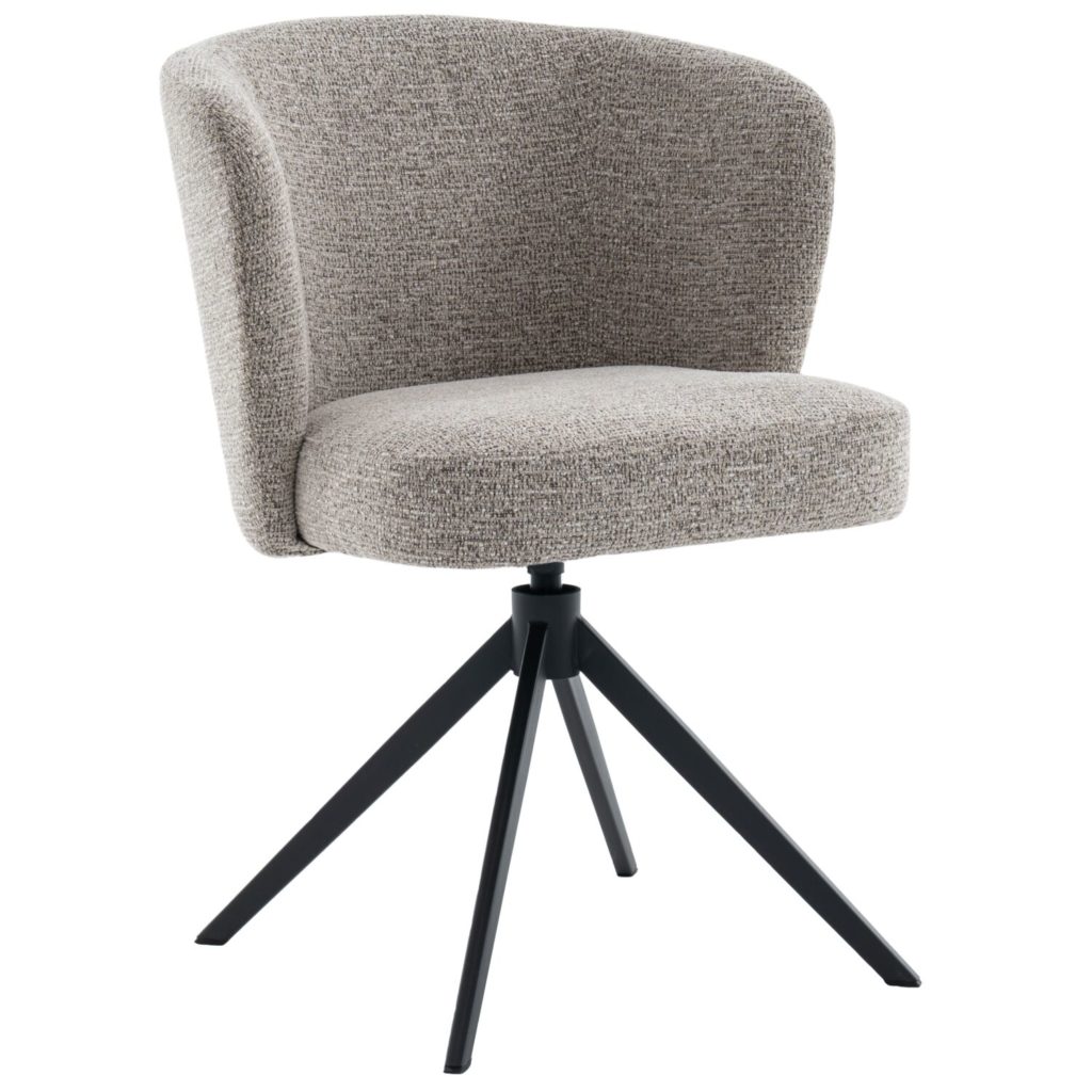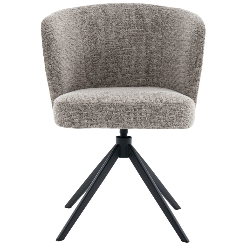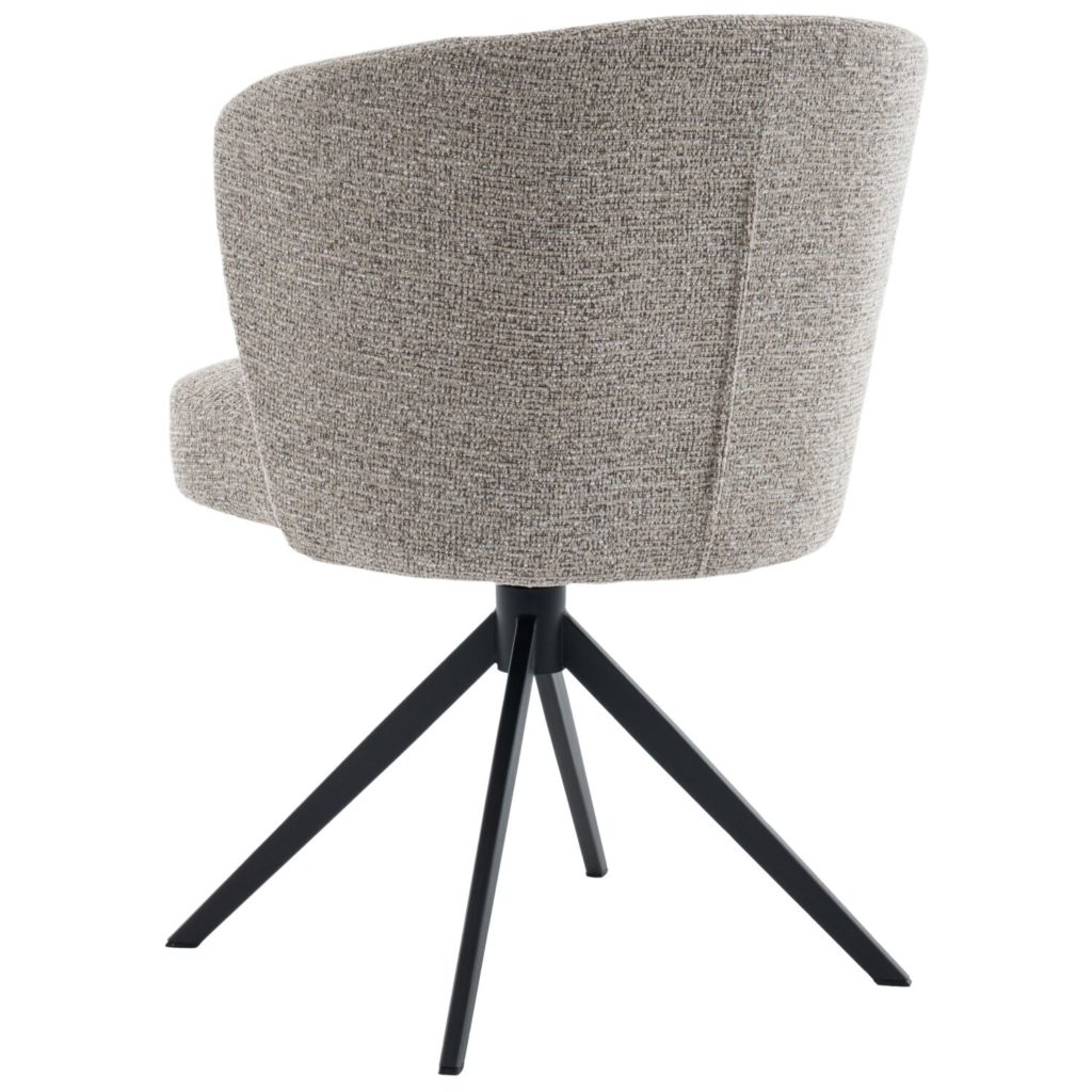 Armstoel Mandolia is met zijn trendy afgeronde vorm een echte eye-catcher voor aan je eettafel. Deze moderne eetkamerstoel is uitgevoerd in een mooie taupe kleurige weefstof en een draaibaar zwart metalen onderstel inclusief terugdraaimechanisme. Hierdoor zal de stoel altijd weer naar zijn oorspronkelijke positie terugdraaien.