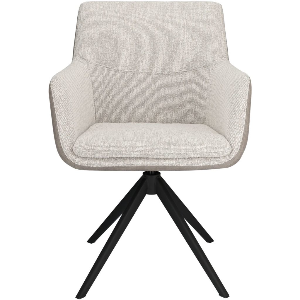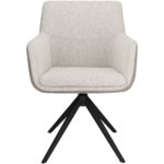 Armstoel Vigios is een elegante stoel met een tijdloze uitstraling. De stoel is uitgevoerd in een mooie duo-stoffering van een beige stof en een bruine microleer en een rank zwart metalen onderstel met terugdraaimechanisme. Door het terugdraaimechanisme staat de stoel altijd netjes recht aan tafel. Verder heeft de armstoel een mooie kuip, deze geeft een goede ondersteuning aan het zit- en rugvlak. Vigios leent zich perfect voor een lang en gezellig samenzijn aan de eettafel.