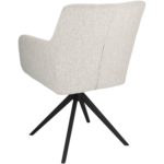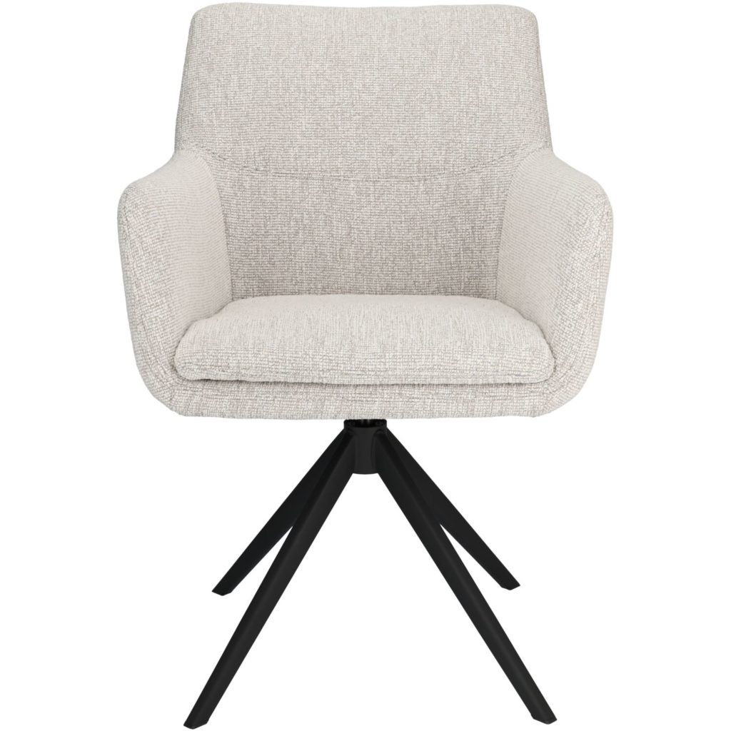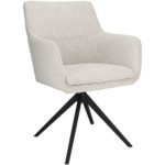 Armstoel Vigios is een elegante stoel met een tijdloze uitstraling. De stoel is uitgevoerd in een mooie beige stof en een rank zwart metalen onderstel met terugdraaimechanisme. Door het terugdraaimechanisme staat de stoel altijd netjes recht aan tafel. Verder heeft de armstoel een mooie kuip, deze geeft een goede ondersteuning aan het zit- en rugvlak. Vigios leent zich perfect voor een lang en gezellig samenzijn aan de eettafel.