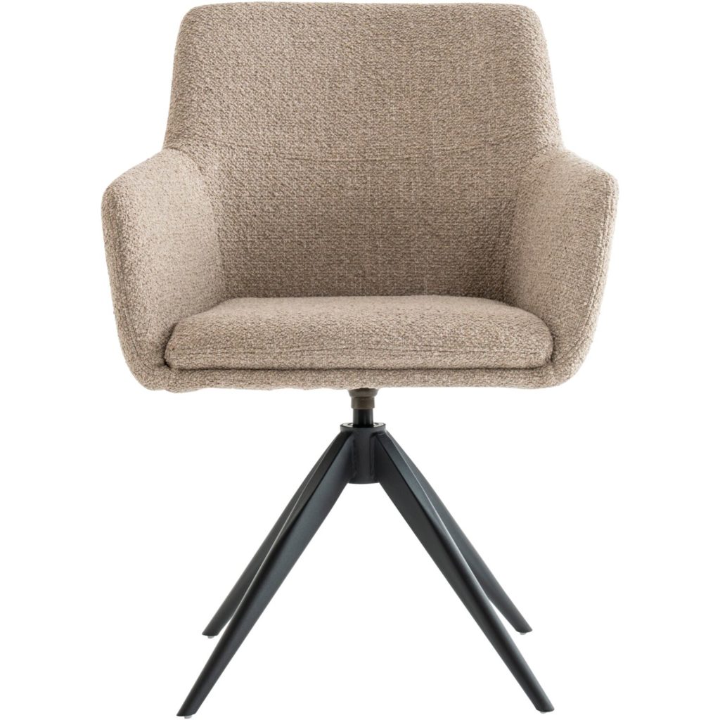 Wat de Vinta een bijzondere armstoel maakt, is de combinatie van unieke eigenschappen. Allereerst heeft de stoel een rank metalen onderstel met een automatisch terugdraaimechanisme, waardoor deze altijd netjes aan tafel staat en je makkelijk “uitstapt”. Een ander leuk detail is dat de stoel verkrijgbaar is in 3 kleurtjes in de prachtige boucléstof rhythm.