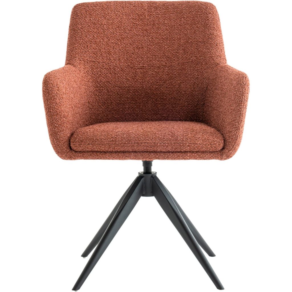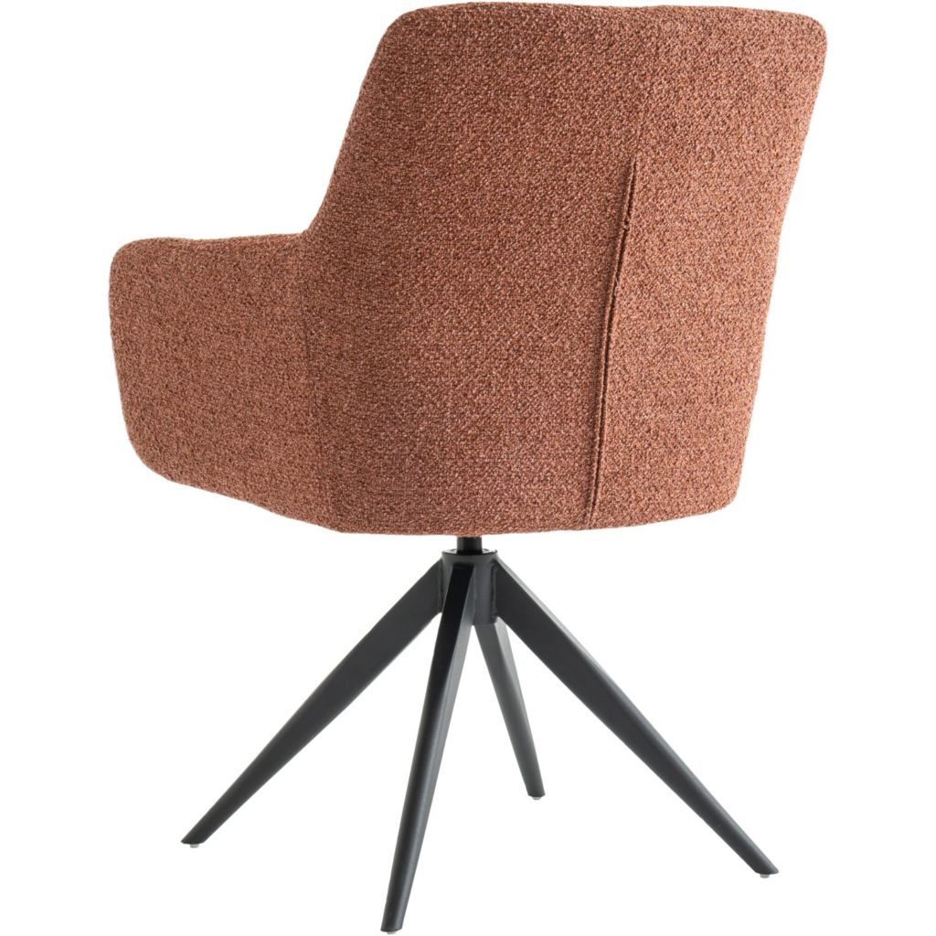 Wat de Vinta een bijzondere armstoel maakt, is de combinatie van unieke eigenschappen. Allereerst heeft de stoel een rank metalen onderstel met een automatisch terugdraaimechanisme, waardoor deze altijd netjes aan tafel staat en je makkelijk “uitstapt”. Een ander leuk detail is dat de stoel verkrijgbaar is in 3 kleurtjes in de prachtige boucléstof rhythm.