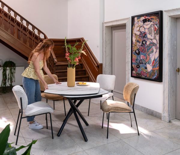 Julia, eetkamerstoel – rough off black frame – stof Lecce
