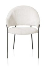 Armstoel Leyla heeft een uniek open design met een zeer fijn 4-pootsframe dat deels doorloopt in de rug. Dit zorgt voor een moderne touch. Ook de mooie platweefselstof met lichte glans Vulcano draagt bij aan deze moderne look. De rugleuning loopt helemaal door aan de zijkanten, wat zorgt voor de unieke armleuningen. Deze armleuningen zijn 66cm hoog en de zithoogte van deze stoel is 50cm. De stoel is verkrijgbaar in 4 kleuren: okergeel, groen, crème en antraciet. Hier zien we de versie in crème afgebeeld.