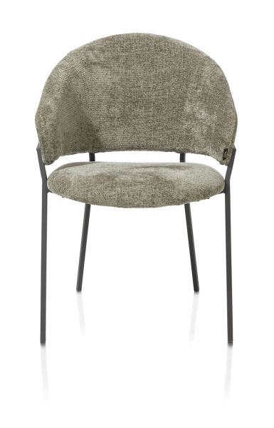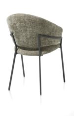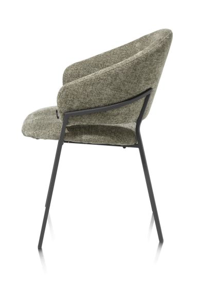 Armstoel Leyla heeft een uniek open design met een zeer fijn 4-pootsframe dat deels doorloopt in de rug. Dit zorgt voor een moderne touch. Ook de mooie platweefselstof met lichte glans Vulcano draagt bij aan deze moderne look. De rugleuning loopt helemaal door aan de zijkanten, wat zorgt voor de unieke armleuningen. Deze armleuningen zijn 66cm hoog en de zithoogte van deze stoel is 50cm. De stoel is verkrijgbaar in 4 kleuren: okergeel, groen, crème en antraciet. Hier zien we de groene versie afgebeeld.