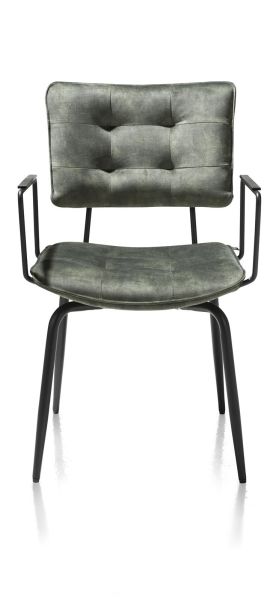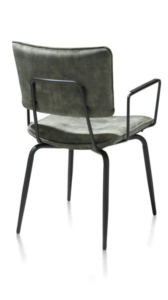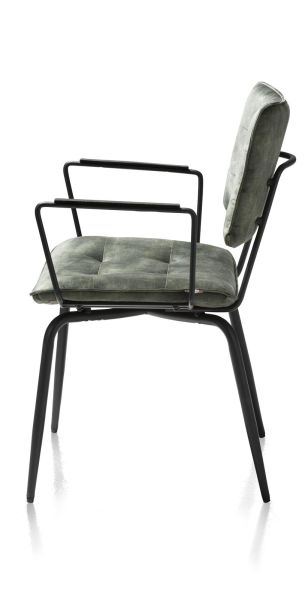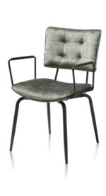Deze armstoel Manou combineert een strak design met sjieke details. De stoel heeft een zwart metalen frame met handige armleuningen in de kleur off black. Voor de bekleding is gekozen voor de microvezelstof Karese, die aanvoelt als velvet, warm en zacht tegelijk. Dankzij de gecapitonneerde rugleuning en zitting krijgt de armstoel een luxe uitstraling. De kleur van deze Manou is olijf, maar is ook in andere kleuren leverbaar. Er is ook een versie zonder armleuningen.