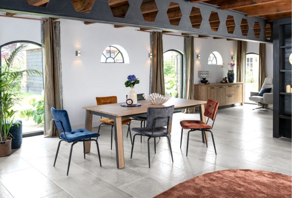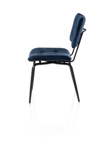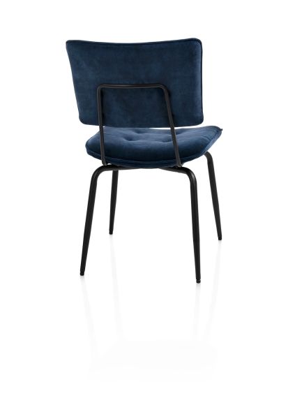 Eetkamerstoel Manou combineert een klassiek ontwerp met een eigentijdse uitstraling. De gecapitonneerde rugleuning en zitting springen direct in het oog. Het doorlopende frame aan de achterkant zorgt niet alleen voor een stijlvol detail, maar ook voor een handige greep waarmee je de stoel eenvoudig kunt verplaatsen zonder de stof aan te raken. Manou is verkrijgbaar in meerdere kleuren. Deze uitvoering is bekleed met de stof Karese in de kleur donkerblauw.