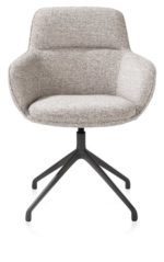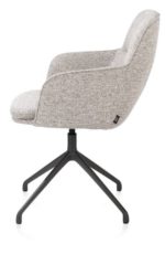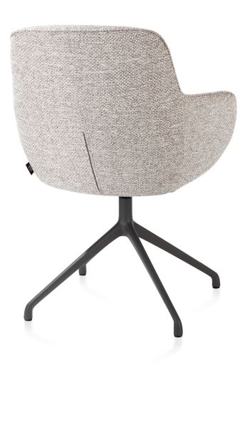 Stoel Mateo verenigt elegantie en comfort in een tijdloos design. Deze armstoel valt op door zijn slanke silhouet, verfijnde stiknaden en zachte bekleding – een elegante toevoeging die moeiteloos verfijning brengt in elke eethoek. De ergonomisch gevormde rugleuning en zitting zorgen voor aangenaam zitcomfort, ook tijdens lange, gezellige diners.Dankzij zijn veelzijdige karakter past Mateo in elk type interieur – van strak en modern tot warm en klassiek. De stoel is verkrijgbaar met of zonder armleuningen, in een ruime keuze aan stoffen en kleuren, en met verschillende onderstellen: vast, met wieltjes of draaibaar voor extra gemak.Deze uitvoering is uitgerust met een draaipoot in graphiet en bekleed met de stof Bellini in kiezel – een harmonieuze mix van ingetogen luxe en een stoer accent.
