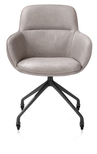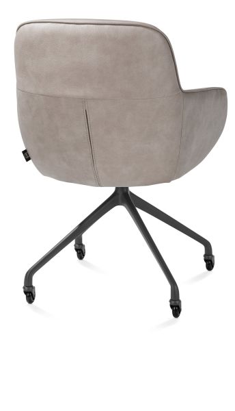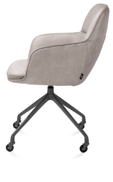 Stijlvol comfortabel: de stoel Mateo. Met armleuningen en bekleed in Pala‑stof in lichtgrijs of antraciet, brengt hij elegantie in je eetruimte. De zachte bekleding en verfijnde stiksels geven een hoogwaardige uitstraling. Voor wie zitplezier met flexibiliteit wil, is er een versie met wieltjes of draaibaar onderstel; wie liever klassiek zit kiest vier pootjes. Het onderstel is leverbaar in Graphiet, Rough off black en Steelbrown – perfect afgestemd op je interieur. Dankzij ergonomisch vormgegeven rug en zitting voelt zitten heerlijk.