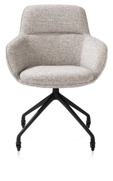 Stoel Mateo weet stijl en comfort feilloos te verenigen. Met zijn slanke vormgeving, elegante stiknaden en zachte bekleding is deze armstoel een verfijnde eyecatcher in elke eetruimte. De ergonomisch gevormde rug en zitting zorgen ervoor dat je zelfs tijdens lange diners ontspannen blijft zitten.Dankzij het tijdloze ontwerp voelt Mateo zich thuis in uiteenlopende interieurs – van modern en minimalistisch tot klassiek en sfeervol. Je hebt ruime keuzemogelijkheden in bekledingen en kleuren, en kunt het onderstel kiezen dat bij jou past: vast, met of zonder wieltjes, of een draaibaar model voor extra gebruiksgemak.Deze variant is uitgevoerd meteen draaipoot op wieltjes in rough off black en bekleed met de stof Bellini in een zachte kiezelkleur – een harmonieuze mix van verfijnde elegantie en een stoer accent.