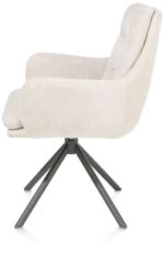 Deze armstoel Mia heeft een centraal onderstel met automatische terugdraaifunctie, alsook een uiterst comfortabele zitting door de grote kuip en extra gevulde rugleuning. Wat het design van deze stoel extra leuk maakt, zijn de horizontale stiknaden die in de rug en zitting doorlopen. De stoel is uitgevoerd in stof Livigno, chenille met een zichtbare vleug. Deze stoel is uitgevoerd in de kleur crème. De stoelen hebben een zitting van 50cm hoog en armleuningen van 66cm hoog. De stoelen meten in totaal 90cm hoog.