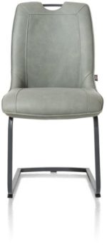 Eetkamerstoel Michiel is in verschillende uitvoeringen en kleuren verkrijgbaar. Deze variant van deze moderne stoel heeft een vierkant, zwart metalen swingframe. Hierop rust een comfortabele kuip, bekleed met de lederlook Pala in de kleur groen. Prettig is de geïntegreerde handgreep in de rugleuning, hiermee is de stoel eenvoudig te verplaatsen.