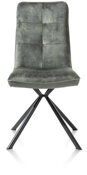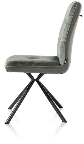 Deze eetkamerstoel Milva heeft een warme groene kleur met een zwart metalen onderstel. De voorzijde van de stoel is bekleed met de stof Karese, de achterzijde met de stof Pala. Dankzij de opvallende vormgeving van de stoelpoten heeft deze eetkamerstoel een fraai eigentijds design. Praktisch is de handgreep op de rugleuning, waarmee de stoel eenvoudig te verschuiven is.
