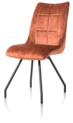 De moderne eetkamerstoel Mischa is in verschillende uitvoeringen en kleuren leverbaar. Deze variant van Mischa is bekleed met de stof Karese in de kleur koper. Karese is een onderhoudsvriendelijke stof met de warme en luxe uitstraling van velours. De stoelpoten zijn van zwart metaal. De rugleuning van deze comfortabele stoel is voorzien van een praktische handgreep. Er zijn 4 verschillende frames voor deze stoel verkrijgbaar.