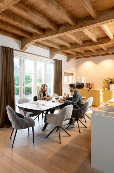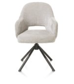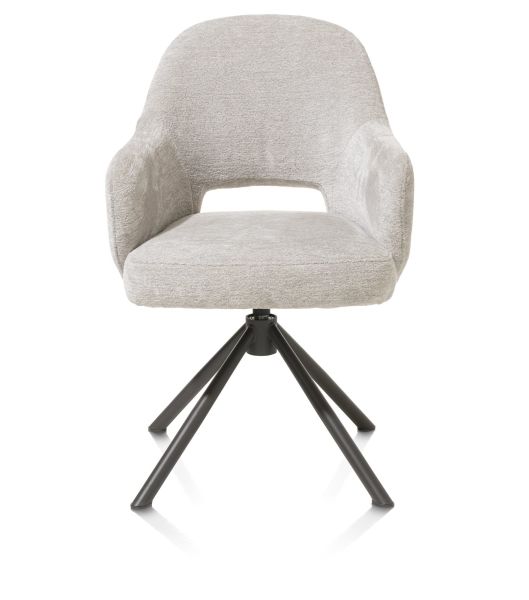 Deze armstoel Nikolas uit de Henders & Hazel collectie heeft een speels, open design dat over heel de stoel doorloopt. De armstoel is bekleed met stof Enzo, een chenillestof met verschillende kleurtinten die mooi door elkaar geweven zijn. Deze versie is uitgevoerd in kleur kiezel, maar er zijn ook nog 3 andere zachte kleurtinten verkrijgbaar! Deze armstoel is uitgevoerd als draaibare versie met automatische terugdraaifunctie. Er zijn ook nog eetkamerstoelen zonder armleuningen verkrijgbaar in deze stoelencollectie, zowel met vaste poten als een draaibaar onderstel.
