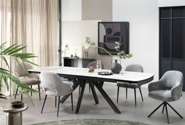Deze armstoel Nikolas uit de Henders & Hazel collectie heeft een speels, open design dat over heel de stoel doorloopt. De armstoel is bekleed met stof Enzo, een chenillestof met verschillende kleurtinten die mooi door elkaar geweven zijn. Deze versie is uitgevoerd in kleur Lava, maar er zijn ook nog 3 andere zachte kleurtinten verkrijgbaar! Deze armstoel is uitgevoerd als draaibare versie met automatische terugdraaifunctie. Er zijn ook nog eetkamerstoelen zonder armleuningen verkrijgbaar in deze stoelencollectie, zowel met vaste poten als een draaibaar onderstel.