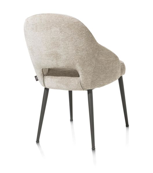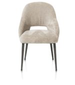 Deze stoel Nikolas uit de Henders & Hazel collectie heeft een speels, open design dat over heel de stoel doorloopt. De stoel is bekleed met stof Enzo, een chenillestof met verschillende kleurtinten die mooi door elkaar geweven zijn. Deze versie is uitgevoerd in kleur Champagne, maar er zijn ook nog 3 andere zachte kleurtinten verkrijgbaar! Deze versie van de stoel is uitgevoerd met 4 vaste poten in de kleur grafiet, maar er is ook een draaibare versie beschikbaar met automatische terugdraaifunctie.