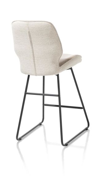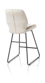 De barstoelen uit collectie Ravi zijn verkrijgbaar in twee hoogtes: een normale barstoel van 98cm hoog met een zitting van 67cm hoog en een extra hoge versie van 114cm hoog met een zitting van 82cm hoog. Dit is de normale versie. De barstoel heeft een modern design met een versmalling in de rug en is uitgevoerd in twee stoffen: vooraan lederlook Secilia en achteraan chenillestof Toba. Deze versie is uitgevoerd in het kleurthema beige.
