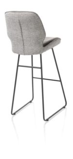 De barstoelen uit collectie Ravi zijn verkrijgbaar in twee hoogtes: een normale barstoel van 98cm hoog met een zitting van 67cm hoog en een extra hoge versie van 114cm hoog met een zitting van 82cm hoog. Dit is de extra hoge versie. De barstoel heeft een modern design met een versmalling in de rug en is uitgevoerd in twee stoffen: vooraan lederlook Secilia en achteraan chenillestof Toba. Deze versie is uitgevoerd in het kleurthema antraciet/grijs.