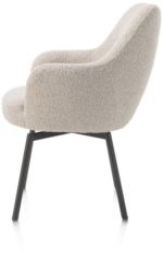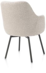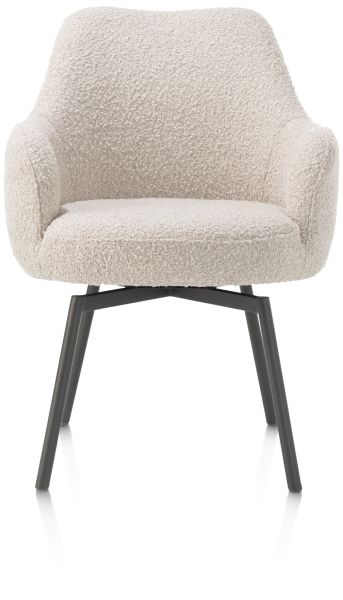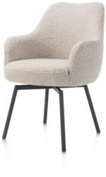 Deze draaibare armstoel Rocco heeft een lekker brede kuip en heeft 4 poten in de kleur grafiet. Daarnaast heb je ook de keuze uit een frame met lichte eikenhouten poten. De stoel is eveneens verkrijgbaar als draaibare eetkamerstoel zonder armleuningen. De zithoogte van deze stoel is 50cm en de stoel is uitgevoerd in de trendy lusjesstof (bouclé) Brioni. De stoel is verkrijgbaar in twee kleuren. Hier zien we de versie in de kleur crème.