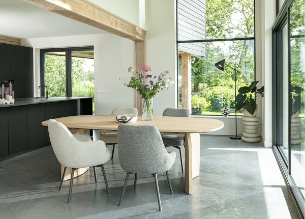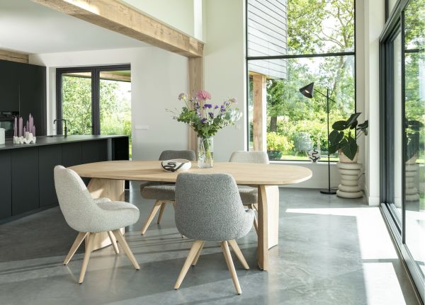 Deze draaibare armstoel Rocco heeft een lekker brede kuip en heeft 4 natuurlijke eikenhouten poten. Daarnaast heb je ook de keuze uit een 4 poten in de kleur grafiet. De stoel is eveneens verkrijgbaar als draaibare eetkamerstoel zonder armleuningen. De zithoogte van deze stoel is 50cm en de stoel is uitgevoerd in de trendy lusjesstof (bouclé) Brioni. De stoel is verkrijgbaar in twee kleuren. Hier zien we de versie in de kleur lever.