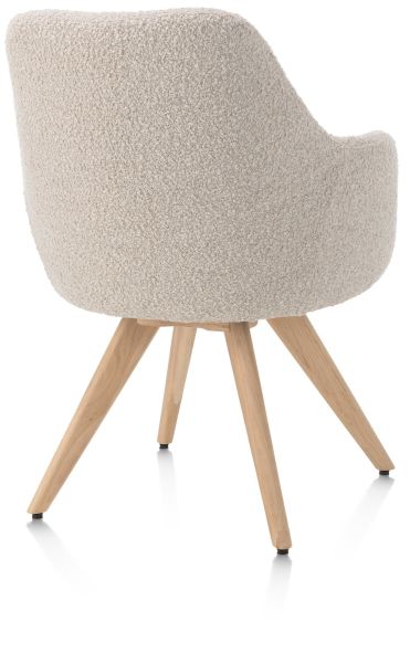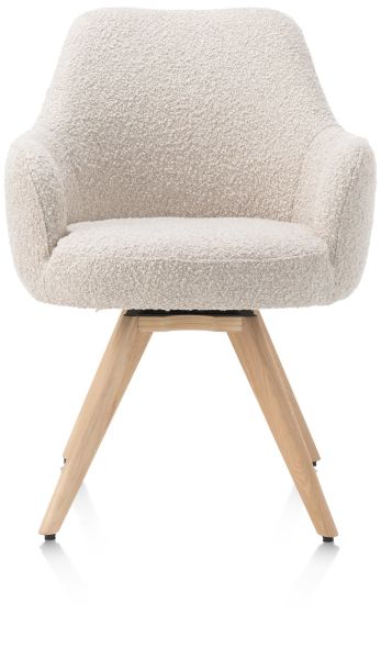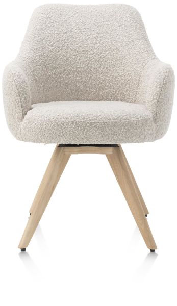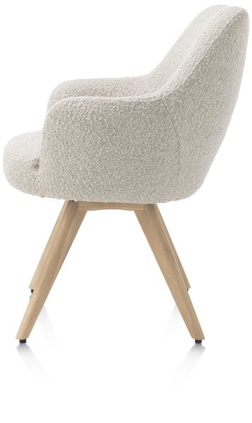 Deze draaibare armstoel Rocco heeft een lekker brede kuip en heeft 4 natuurlijke eikenhouten poten. Daarnaast heb je ook de keuze uit een 4 poten in de kleur grafiet. De stoel is eveneens verkrijgbaar als draaibare eetkamerstoel zonder armleuningen. De zithoogte van deze stoel is 50cm en de stoel is uitgevoerd in de trendy lusjesstof (bouclé) Brioni. De stoel is verkrijgbaar in twee kleuren. Hier zien we de versie in de kleur crème.