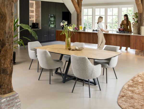 Eetkamerstoel Rocco staat voor comfort met een moderne uitstraling. De brede kuip biedt veel zitruimte en is bekleed met de stof Oregon in de kleur beige, een rustige en neutrale tint die makkelijk te combineren is. Het draaibare onderstel met vier poten in grafietkleur zorgt voor extra gebruiksgemak aan tafel. Liever een warmere look? Dan is er ook een uitvoering met lichte eikenhouten poten. Rocco is ook verkrijgbaar als armstoel, handig voor wie net wat meer ondersteuning wil. Een veelzijdige stoel die perfect past in een eigentijds interieur.
