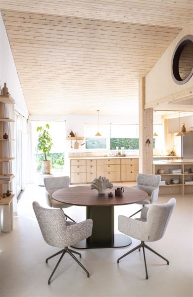 Armstoel SAGE in crèmekleur combineert zachte elegantie met praktisch comfort. De stoel is bekleed met stof Luton, een bouclé-achtige meubelstof met een aangenaam zachte, aaibare structuur. Het draaibare onderstel in rough off black voegt gebruiksgemak toe en maakt deze armstoel ideaal voor lange, ontspannen diners.