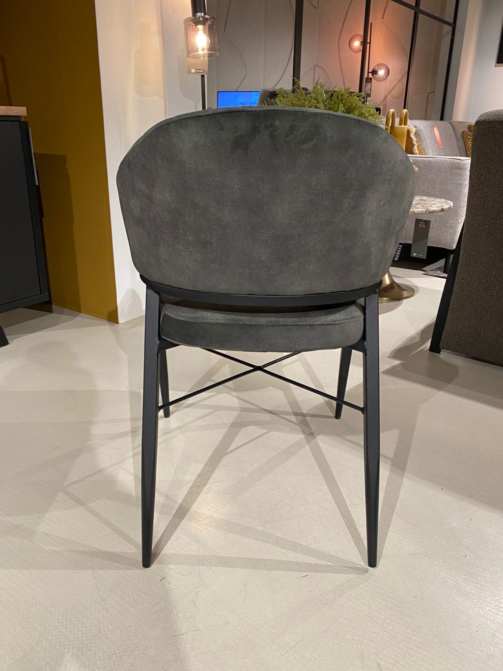 Uitgevoerd in stof goldy hunter met zwarte metalen poten.