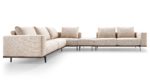 De Pitt Street bank is een stijlvolle combinatie van flexibiliteit en luxe. De lichte beige stof Marvin, afgewerkt met een cacaokleurige lederen plint, creëert een verfijnd contrast. Met elegante rugkussens en modulaire elementen past de bank zich moeiteloos aan iedere woonruimte aan. Zoals getoond: 2,5-zits arm links + verlengde hoek rechts + tussenhocker + 2,5-zits rechts.