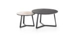 De Remuera salontafelset bestaat uit twee ronde tafels met een stevig metalen onderstel. De combinatie van een donkerbruin tot zwart blad met houtstructuur en een blad met steenlook in beige- en grijstinten zorgt voor een mooi contrast. Het blad is uitgevoerd in HPL, een sterk en onderhoudsvriendelijk materiaal. Het zwarte metalen onderstel zorgt voor een rustig geheel. Door het hoogteverschil schuiven de tafels eenvoudig onder elkaar en gebruik je ze flexibel samen of los. Afmetingen: H42 × Ø70 cm; H36 × Ø50 cm.