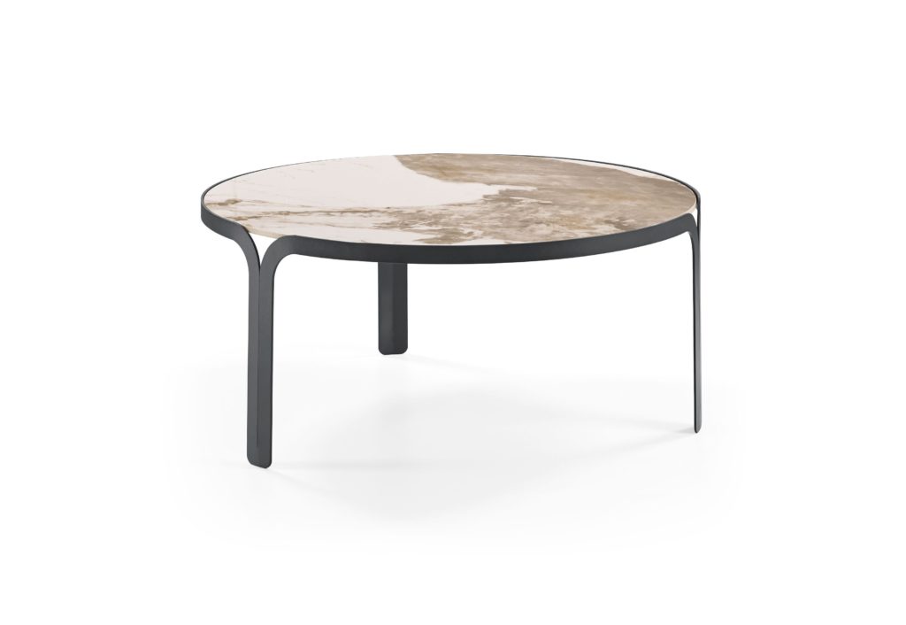 Een moderne bijzettafel, welke gekenmerkt wordt door een rond blad op een eigenzinnig vormgegeven, metalen onderstel. Het keramieken blad in de prachtige kleur marmer calcatta met metalen frame zwart gelakt. Zoals getoond: bijzettafel met zwart metalen onderstel en blad in keramiek marmer calcatta. Afmetingen: H40 x ø90 cm.
