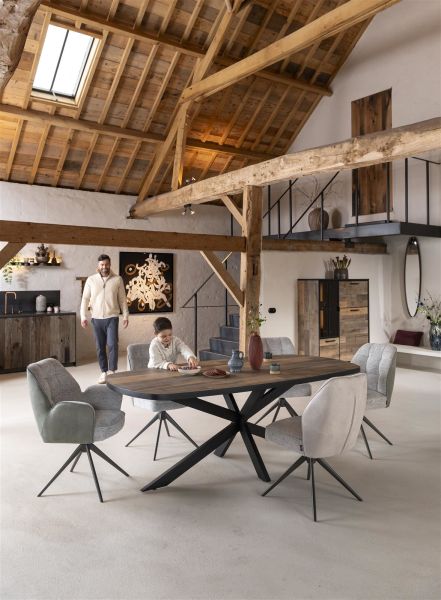 Deze ovale bartafel uit de Avalox-collectie is een stijlvolle blikvanger in elk interieur. De afgeronde lijnen zorgen voor een moderne, organische look. Het tafelblad is gemaakt van Primo Laminato – een sterk en onderhoudsvriendelijk materiaal met de uitstraling van massief hout – en verkrijgbaar in twee elegante kleuren: driftwood (zoals afgebeeld) en oak natural vintage. Het zwarte metalen onderstel is beschikbaar in twee uitvoeringen: met stoere V-poten of, zoals deze, met vier losse poten. Dit model meet 240 x 110 cm, maar is ook in andere afmetingen verkrijgbaar.
