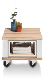 Dit bijzettafeltje van 60x50cm uit de Jardin-collectie van Henders & Hazel heeft een frisse landelijke uitstraling. Opvallend aan het tafeltje is de combinatie van materialen en kleuren en het toch wel strakke design. De bijzettafel is gemaakt van eikenfineer in Railway Brown gecombineerd met MDF in de kleur Pure White. Dankzij de wieltjes is het tafeltje makkelijk te verplaatsen. De wieltjes zijn geschikt voor gladde vloeren. De bijzettafel wordt eveneens geleverd met pootjes, dus je kan kiezen of je liever pootjes of wieltjes wilt.