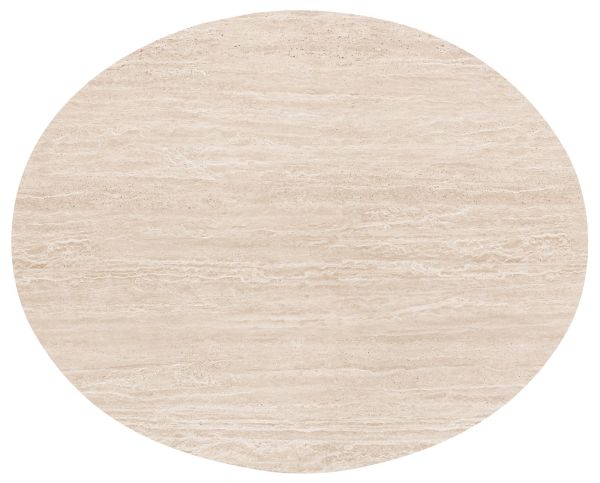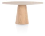 Eetkamertafel ARAS is met zijn ovalen blad en centrale conische poot een eyecatcher voor je interieur. Het blad heeft een afmeting van 150 x 120 cm en is gemaakt van Primo Laminato (HPL) in travertinlook. Het onderstel van ARAS is uitgevoerd in gelakt eikenfineer. De consche poot is aan de binnenzijde verzwaard om maximale stabilteit van de tafel te garanderen. Wil je de rechte lijnen in je interieur doorbreken en je interieur meer zachtheid geven? Dan is ARAS jóuw eetkamertafel!