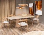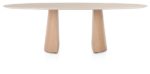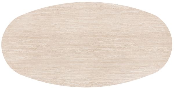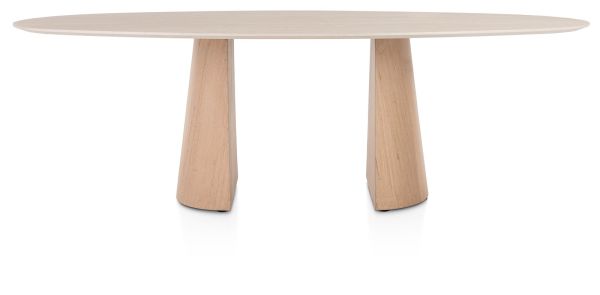 ARAS is een prachtige eetkamertafel die de rechte lijnen in je interieur doorbreekt. Het tafelblad van Primo Laminato (HPL) heeft een ovalen vorm in travertinlook. De twee halve conische poten van gelakt eikenfineer geven ARAS een eigenzinnige look. De poten zijn aan de binnenzijde verzwaard om maximale stabilteit van de tafel te garanderen. Dankzij de royale afmeting van 240 x 120 cm is er plek voor het hele gezin!