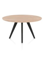 De ARVADA tafel met rond blad van 125 cm combineert een compact formaat met een tijdloze vorm. Het tafelblad is uitgevoerd in gelakt, massief eikenhout in de kleur natural. De zichtbare houtnerf in het blad geeft de tafel een stoere en natuurlijke uitstraling. Deze uitvoering staat op een metalen 4-poot in de kleur off-black. Het onderstel is ook in andere kleuren te verkrijgen: grafiet, crème en steelbrown.