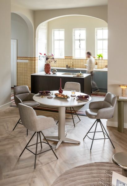 De ronde bartafel Caletta met een HPL Primo Laminato tafelblad in de kleur travertin straalt rust en moderniteit uit. Het tafelblad heeft de uitstraling van natuursteen en is tegelijk praktisch en eenvoudig te onderhouden. Het donkere onderstel geeft een mooi contrast en zorgt voor een stabiele en comfortabele zit. Deze tafel is ook verkrijgbaar in marble brown.