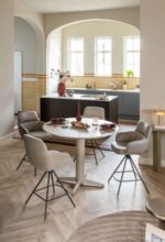 De ovale Caletta eetkamertafel met eiken tafelblad in de kleur basalt en een centrale teenpoot in steelbrown straalt warmte en elegantie uit. Het donkere hout geeft de tafel een rijke, sfeervolle uitstraling, terwijl de bruin metalen poot zorgt voor een zachte, moderne afwerking. Een uitnodigende tafel die perfect past in een stijlvol interieur.