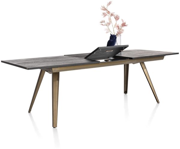 Uitschuiftafels: ze zijn ideaal als je regelmatig meerdere gasten aan tafel hebt, maar niet de ruimte voor een extra grote eetkamertafel hebt. Natuurlijk heeft de City-collectie ook uitschuifbare eetkamertafels in het assortiment. Deze tafel heeft een tafelblad van eikenfineer in de kleur castle antraciet en poten in de kleur champage gold. In deze uitvoering is de tafel in twee afmetingen verkrijgbaar: 190×100 cm en 160×100 cm. Beide tafels zijn eenvoudig met 50 cm te verlengen.