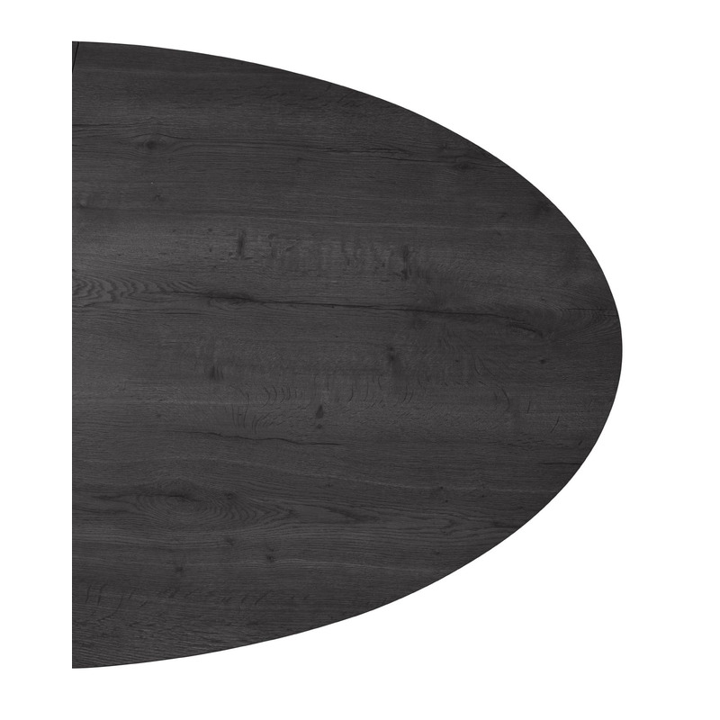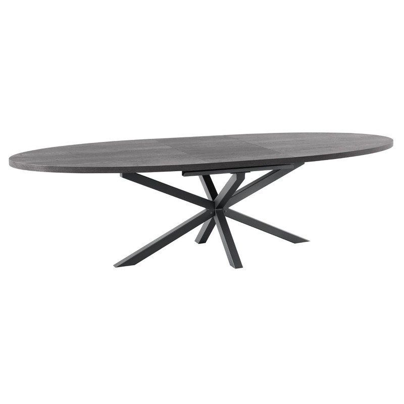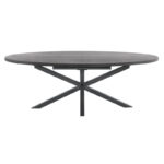 Deze eettafel heeft een ovaal blad in kleur noir decor en een zwarte metalen spinpoot. De tafel is 102 cm breed en heeft een lengte van 201,5-258 cm, waardoor je in totaal zeker 6 tot 8 stoelen aan deze tafel kwijt kunt. De hoogte tot de onderkant van de tafel is ca. 72,4 cm; dit is belangrijk als je er armstoelen aan wilt zetten. De eettafel is uitstekend te combineren met de andere meubelen uit de Formia serie.