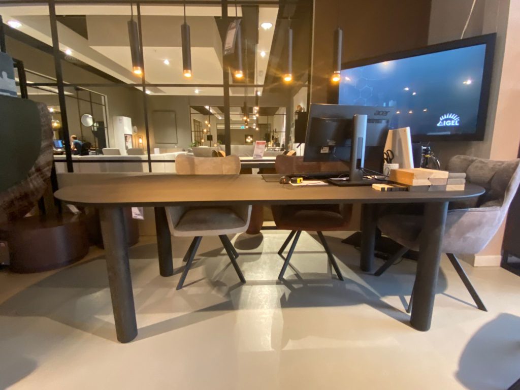 Uitgevoerd met een plat ovaal massief eiken blad (3 cm. dik)