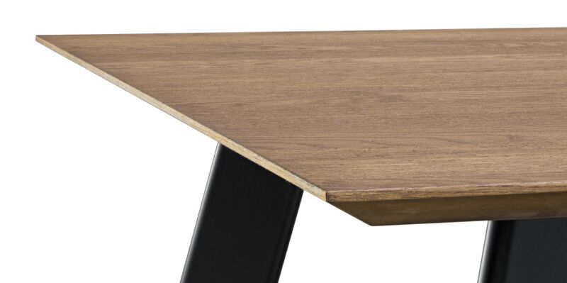Eettafel Verdo springt meteen in het oog door de mooie vormgeving. De combinatie tussen het eiken fineer in kasteelbruin en de zwarte metalen poten geeft de tafel een frisse en eigentijdse look. De tafel is voorzien van een zwart metalen ZOVAL-onderstel; de U-poten lopen hierbij wat naar buiten uit. De onderkant van het tafelblad is zwart gelakt, wat de tafel een moderne uitstraling geeft.