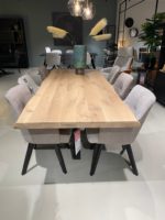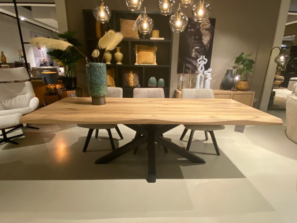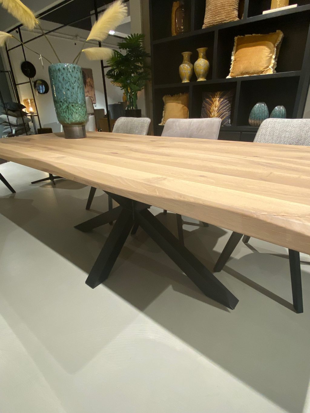 Uitgevoerd met een boomstamblad in 6 cm. massief rustiek eikenhout (opgedikt 2+2+2 cm.) in de kleur naturel geborsteld met metalen XX-spinpoot 8×8 cm. in de kleur zwart.