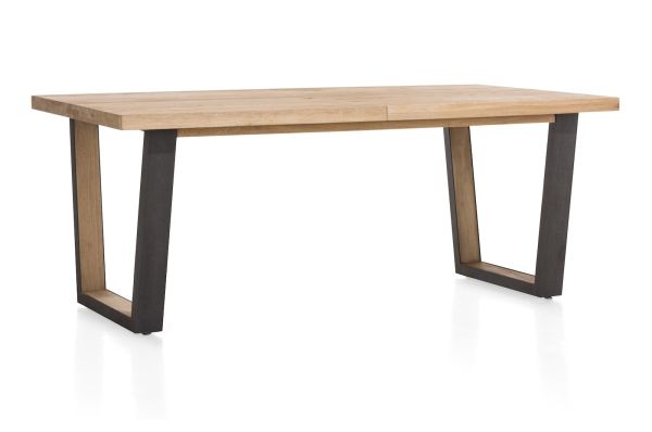 Deze robuuste uitschuifbare eetkamertafel uit de Metalox collectie van Henders & Hazel heeft een modern design. Een opvallend detail is de boomschorsrand rondom het houten tafelblad. De tafelpoten in V-vorm zijn een combinatie van hout en metaal. Ingeschoven is deze tafel 190 x 100 cm, uitgeschoven komt er 50 cm bij. Ideaal als er meer gasten blijven mee-eten.
