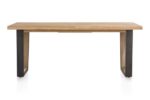 Deze moderne eettafel is afkomstig uit de Metalox-collectie van Henders & Hazel en is uitschuifbaar. Altijd handig als er extra gasten blijven mee-eten. De tafel heeft een fraai houten tafelblad. Opvallend zijn echter de tafelpoten, deze zijn een combinatie van hout en metaal en hebben een stoere V-vorm. Ingeschoven is deze tafel 190 x 100 cm, uitgeschoven komt hier 50 cm bij.