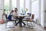 Een (bijna) ronde, uitschuifbare eetkamertafel, kan dat? Jazeker! Deze ‘vals ronde’ tafel uit de Metalox-collectie is standaard 150 cm, maar is eenvoudig te verlengen met 40 cm. In uitgeschoven stand is de tafel niet meer (bijna) rond, maar ovaal. Het tafelblad van deze eetkamertafel is van massief eikenhout. De centrale tafelpoot, met opvallend design, is van zwart metaal.