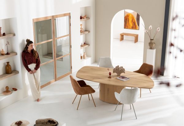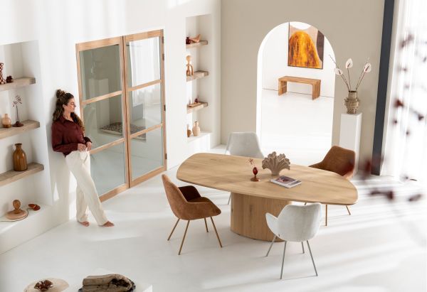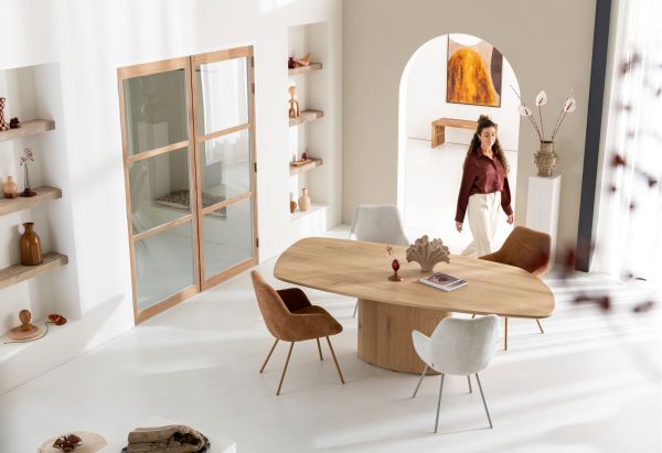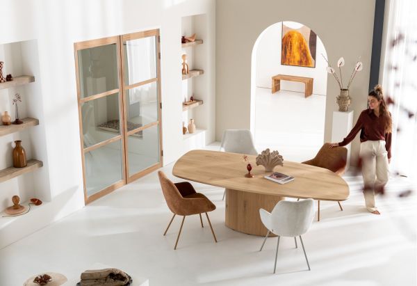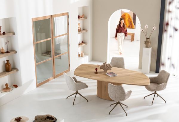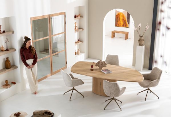 Droom je van een organische eetkamertafel met een natuurlijke look? Laat je verrassen door PALMA in de kleur naturel. Hij blad is uitgevoerd in massief eikenhout en staat op een centraal onderstel in naturelkleur eikenfineer. Het onderstel heeft de vorm van een ellipsvormige kolom. De poot is aan de binnenzijde verzwaard om maximale stabilteit van de tafel te garanderen. Eetkamertafel PALMA heeft de royale afmeting van 270 x 120 cm. Hij is verkrijgbaar in meerdere formaten. Kijk ook eens naar salontafel PALMA!