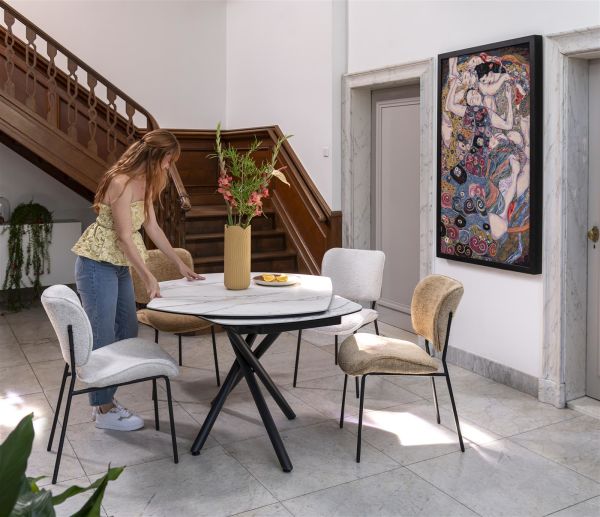 Wil je een eettafel die niet teveel plaats inneemt, maar waaraan je wel al je vrienden kunt uitnodigen? Dan is de Preston uitschuiftafel precies wat je zoekt. Hij heeft een basisformaat van 120x90cm en fraaie afgeronde hoeken. Met een super handig draaimechanisme vergroot je deze compacte tafel echter tot een ruime tafel van 180 cm wanneer je maar wilt! De centrale poot zorgt ervoor dat je aan alle kanten prettig kunt zitten en het oersterke keramiek op glas blad maakt de tafel uitermate ‘feestbestendig’. Deze uitvoering heeft een witte marmerlook, maar, maar hij is er ook met een antraciet blad.