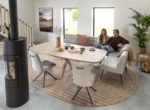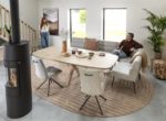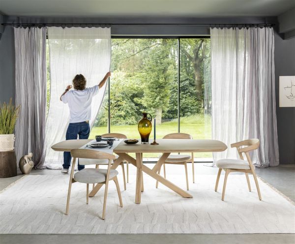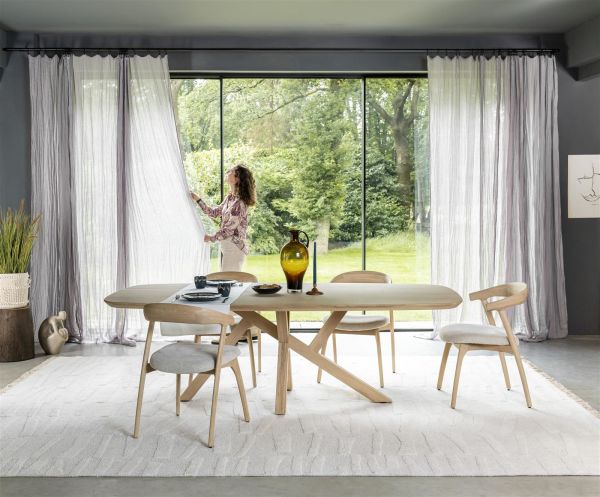De tafelserie Shimla wordt gekenmerkt door haar Scandinavische look van massief Duits eikenhout en de erg unieke designpoot met atypische kruisvorm. De tafel past perfect binnen de Scandinavische stijl door het ovale tafelblad zonder rechte hoeken. Dit geeft de tafels een zacht karakter. Tafelserie Shimla is verkrijgbaar in 4 verschillende formaten. Hier zien we de uitvoering met een tafelblad van 240x120cm.