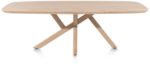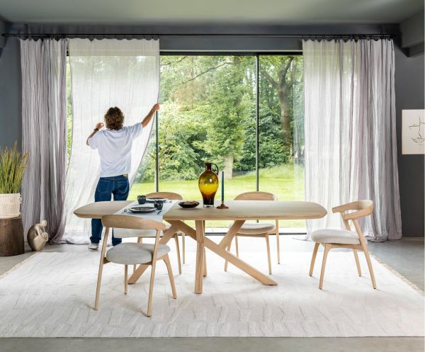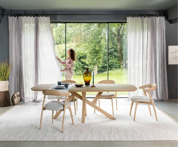 De tafelserie Shimla wordt gekenmerkt door haar Scandinavische look van massief Duits eikenhout en de erg unieke designpoot met atypische kruisvorm. De tafel past perfect binnen de Scandinavische stijl door het ovale tafelblad zonder rechte hoeken. Dit geeft de tafels een zacht karakter. Tafelserie Shimla is verkrijgbaar in 4 verschillende formaten. Hier zien we de grootste uitvoering met een tafelblad van 270x120cm.